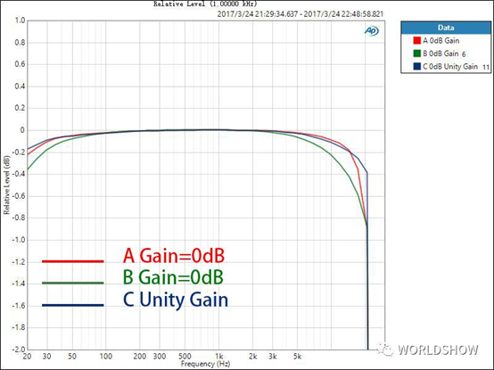 對(duì)于數(shù)字調(diào)音臺(tái),我們不僅要關(guān)心話放增益在0dB時(shí)的THD+N比率,還需要了解到,話放增益在不同位置時(shí)的情況,因?yàn)檫@是使用中的實(shí)際情形。話放的增益在不同大小時(shí),其引入的噪音和失真也是不同的,了解這一點(diǎn)對(duì)于用戶正確設(shè)置增益也很有參考意義。