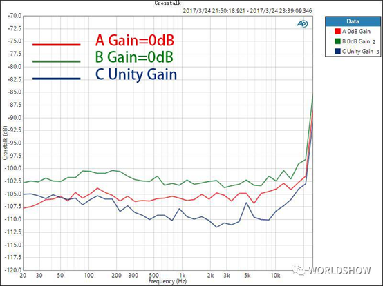 從上面三張圖可以看出:A、B兩張臺(tái)的話放是類似的設(shè)計(jì),只是本底噪聲和失真不同; C調(diào)音臺(tái)雖然本底噪聲最低,但在高增益的情況下失真在整個(gè)中頻段增加明顯,說(shuō)明C調(diào)音臺(tái)話放設(shè)計(jì),不如A調(diào)音臺(tái)。