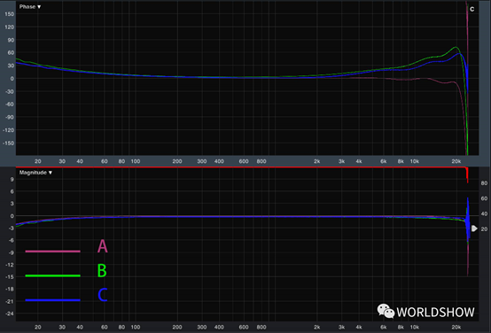 由圖可見三款產(chǎn)品的頻率響應(yīng)都能達(dá)到要求,幅頻響應(yīng)在±0.5dB之內(nèi),相頻響應(yīng)都在±30°之內(nèi),這其中還有一定的測(cè)量誤差。而三者之間的幅頻響應(yīng)差別還是顯而易見的,B型號(hào)的頻率響應(yīng)明顯比A和C差一些。