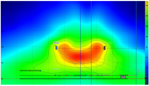 以下兩個(gè)系統(tǒng)仿真圖模擬了10顆雙10寸線陣列揚(yáng)聲器在同一個(gè)劇場(chǎng)中對(duì)三層觀眾席最后一排的覆蓋情況(為了便于觀察,陣列被設(shè)置在了劇場(chǎng)的中軸線上)。第一張圖是陣列吊掛高度為15米,基本與第三層最后一排觀眾席持平,陣列物理姿態(tài)調(diào)整至如圖狀態(tài)后能夠在三層最后一排得到令人滿意的覆蓋。