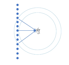 如圖,左邊一列圓點(diǎn)為換能器陣列,兩個(gè)圓以聽(tīng)音者為圓心,它們的半徑差對(duì)應(yīng)著被考察頻率的1/3波長(zhǎng),離聽(tīng)音者最近的換能器到達(dá)時(shí)間最短,越靠陣列兩端,到達(dá)聽(tīng)音者的時(shí)間越慢。當(dāng)?shù)竭_(dá)時(shí)間晚于1/3波長(zhǎng)時(shí),我們認(rèn)為換能器在這個(gè)頻率上對(duì)聽(tīng)音點(diǎn)沒(méi)有貢獻(xiàn)。