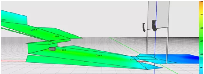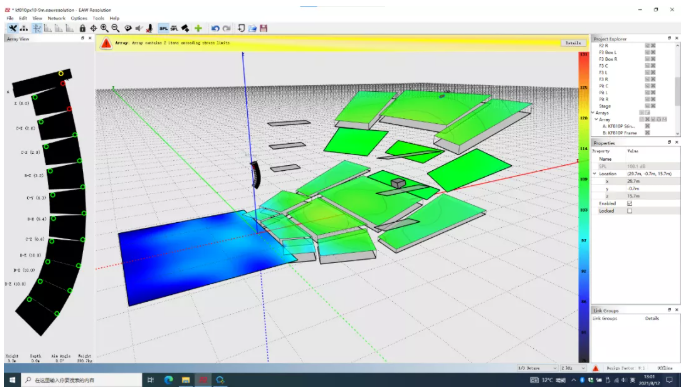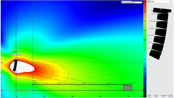 我們可以看到,為了獲得較為滿意的覆蓋結(jié)果,傳統(tǒng)線陣列在吊點(diǎn)高度不足時(shí)必須以接近極限的物理姿態(tài)來(lái)進(jìn)行安裝。請(qǐng)注意最上面2顆音箱的快插銷已經(jīng)出現(xiàn)了載荷警報(bào),呈現(xiàn)紅色。在實(shí)際項(xiàng)目中如果遇到此類情況,就不得不在吊裝位置和覆蓋效果之間做出妥協(xié)。