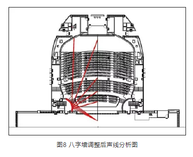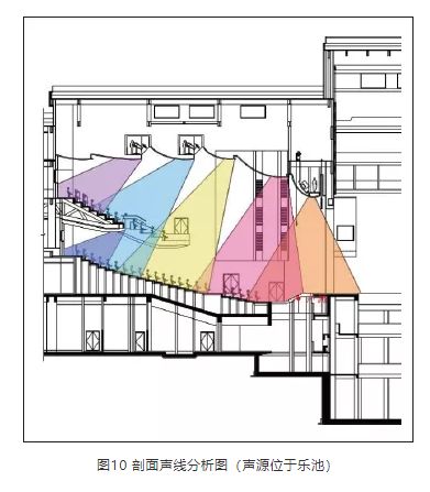 觀眾廳剖面設(shè)計取決于兩個因素。一是規(guī)范規(guī)定的每座容積,它能確定觀眾廳吊頂?shù)拇蟾鸥叨龋欢怯^眾廳剖面聲線分析,它能確定吊頂?shù)淖罱K形式。結(jié)合上述兩個因素,最終確定的吊頂形式如圖9、圖10所示。可以看出,經(jīng)吊頂反射的聲音能覆蓋觀眾席的所有區(qū)域,其分布均勻,能達(dá)到良好的聲場效果。