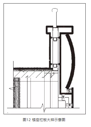 樓座欄板應(yīng)避免垂直面,做吸聲或擴(kuò)散處理。根據(jù)觀眾廳混響時間控制,以及結(jié)合內(nèi)裝裝飾效果,在欄板部分做弧形擴(kuò)散處理,大樣示意見圖12。