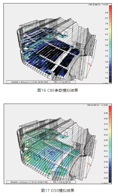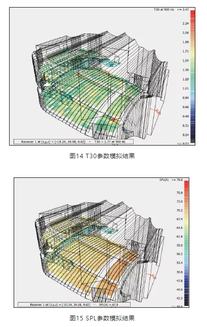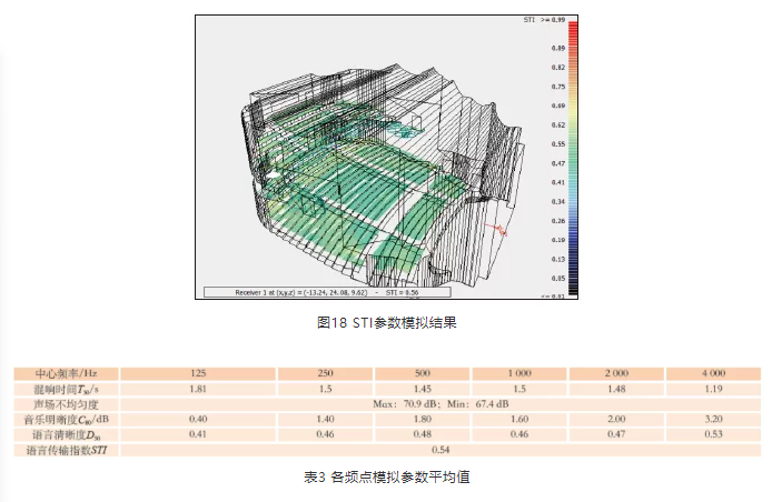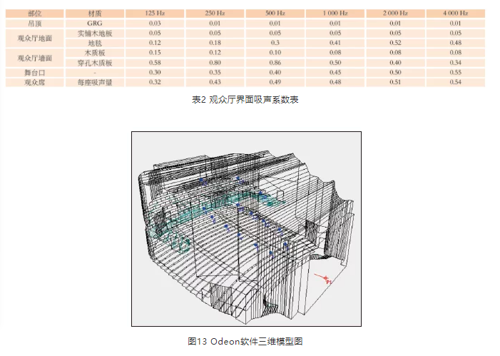 混響時間設(shè)計完成后, 采用Odeon軟件對聲場環(huán)境進(jìn)行模擬,對方案起到一定的校正作用。觀眾廳各部位吸聲系數(shù)見表2,圖13為模擬軟件中三維模型圖,圖14~圖18為各參數(shù)的模擬結(jié)果,表3為各測點平均值。