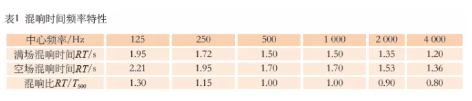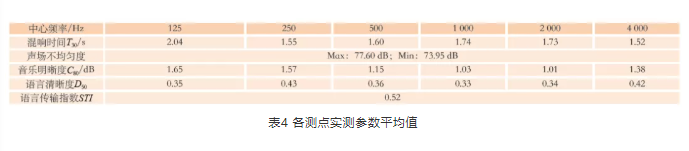 語言清晰度是評價廳堂語言聲是否清晰的參數(shù),所有倍頻程測量結(jié)果均大于0.3,略小于要求的≥0.45,可能是由于空場環(huán)境缺少觀眾吸聲造成的。